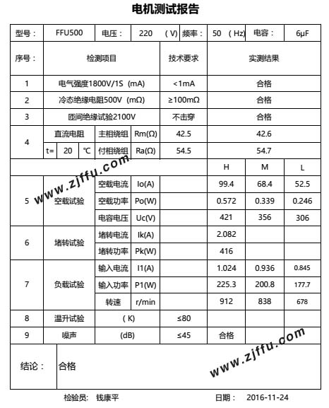 FFU500電機測試報告 型號:FFU500 電壓:220 (V) 頻率:50 (Hz) 電容:6mF 1、檢測項目:電氣強度1800V/1S (mA);技術要求:<1mA;實測結果:合格。 2、檢測項目:冷態(tài)絕緣電阻500V (mQ);技術要求:>100mQ;實測結果:合格。 3、檢測項目:匝間絕緣試驗2100V;技術要求:不擊穿;實測結果:合 …