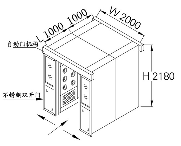 1.全自動(dòng)平移門(mén)貨淋室由箱體、自動(dòng)門(mén)、自動(dòng)門(mén)系統(tǒng)、高效過(guò)濾器、送風(fēng)機(jī)、配電箱、噴嘴等幾大部件組成。