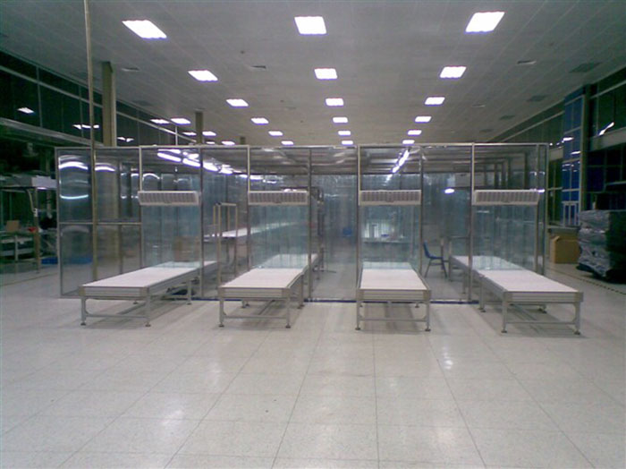 材料以鋼方通噴塑作為框架,采用風(fēng)機濾網(wǎng)機組FFU送風(fēng),凈化棚四周圍用防靜電垂簾,頂部鋪蓋密縫盲板,形成一個密縫區(qū),內(nèi)部凈化級別可達(dá)10—100000級;特別適用于車間內(nèi)局部凈化級別要求高的區(qū)域,如流水線作業(yè)區(qū)域。高精確度產(chǎn)品組裝區(qū)。技術(shù)人員正在安裝千級潔凈棚千級潔凈棚|1000級潔凈棚特點: